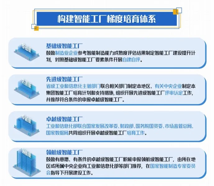 【鏈接:智能工廠梯度培育體系】2024年,工業和信息化部、國家發展改革委、財政部、國務院國資委、市場監管總局、國家數據局等六部門聯合印發通知,部署開展2024年度智能工廠梯度培育行動。明確將構建智能工廠梯度培育體系,按照《智能工廠梯度培育行動實施方案》《智能工廠梯度培育要素條件》,分基礎級、先進級、卓越級和領航級四個層級開展智能工廠梯度培育。